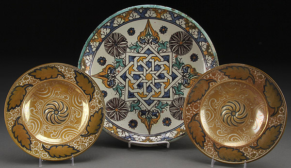 A PAIR OF BATTALION CANTAGALLI MAJOLICA PLATES, 19TH OR EARLY 20TH CENTURY. With gold lustre florals and embossed swirled rosette centers, accented in cobalt blue, the verso with blue rooster mark. Together with a Isnick style decorated pottery console bowl. Diameter 12.75 inches (32 cm) and 8.125 inches (20.5 cm).