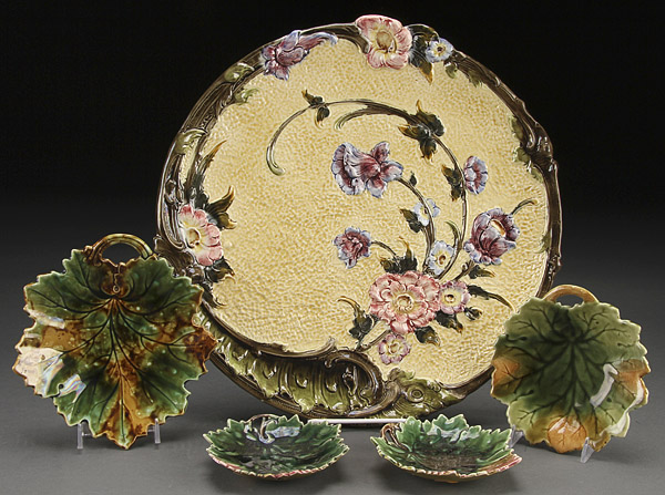 A LARGE AUSTRIAN MAJOLICA CHARGER, LATE 19TH CENTURY. With Art Nouveau florals and polychrome glaze, diameter 14.5 inches (37 cm), together with four German Majolica leaf form plates.