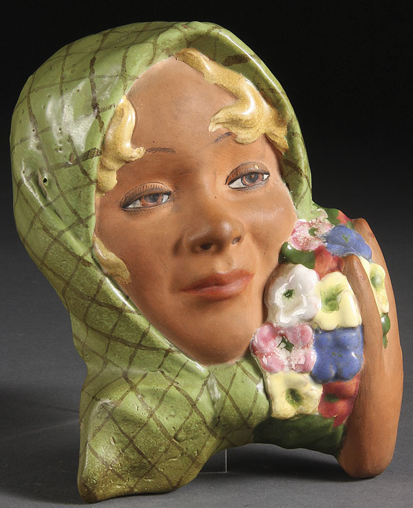 A FINE AUSTRIAN ART DECO TERRACOTTA WALL PLAQUE. Of a young girl with floral bouquet in molded relief. Height 9 inches (23 cm).