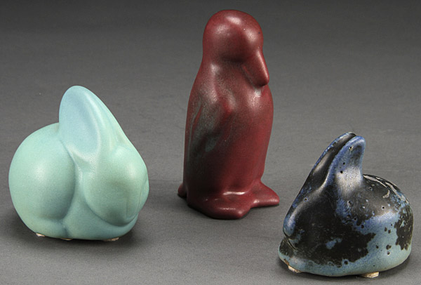 A THREE PIECE VAN BRIGGLE AMERICAN ART POTTERY FIGURAL GROUP, CIRCA 1920S AND 1930S. Comprising a Persian rose decorated penguin coin bank, an early blue and black glazed rabbit paperweight and a later turquoise glazed rabbit paperweight. The largest 4.25 inches (11 cm).