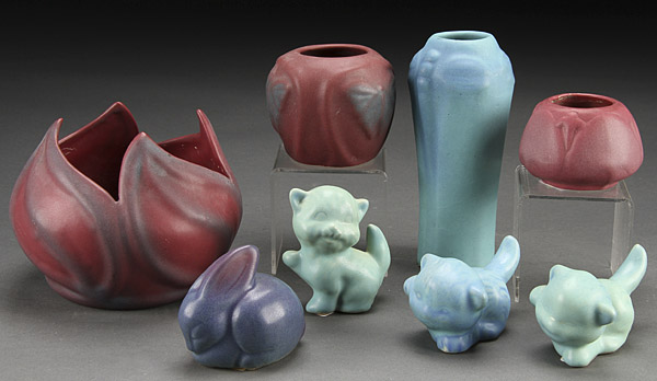 AN EIGHT PIECE GROUPING OF VAN BRIGGLE AMERICAN ART POTTERY, 1930'S AND LATER. Comprising a stylized leaf form bowl, butterfly vase, dragonfly vase, small stylized leaf vase, three cat figures and a rabbit figure. The largest height 6.75 inches (17 cm).