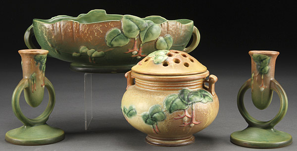 A FIVE PIECE ROSEVILLE "FUCHSIA" ART POTTERY GROUP, CIRCA 1939. Comprising a handled jardinière, flower frog, console bowl and two candlesticks. The largest 12.5 inches (32 cm).