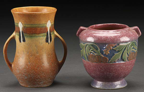 ROSEVILLE "MONTICELLO" AND "BANEDA" HANDLED ART POTTERY VASES, CIRCA 1931 AND 1933. Both unmarked. Height 5.25 inches and 4 inches (13.2 and 10.2 cm).
