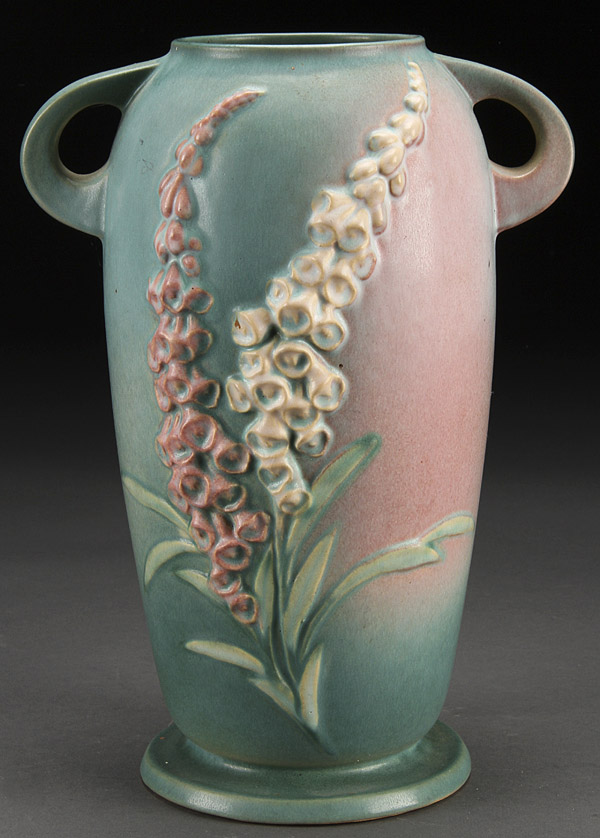 A ROSEVILLE FOXGLOVE AMERICAN ART POTTERY HANDLED VASE, CIRCA 1940S. With embossed florals on a shaded pink and blue ground. Embossed mark and shape number 52. Height 12.25 inches (31 cm).