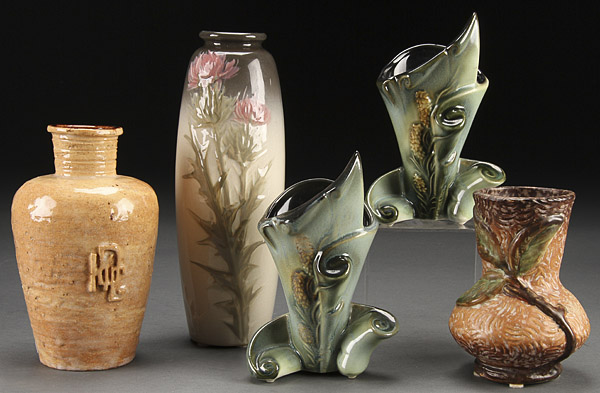 A FOUR PIECE WELLER AND HULL ART POTTERY GROUP, 1ST HALF 20TH CENTURY. Comprising an "Etna" vase with embossed thistle, a "Malverne" vase, two Hull console vases together with a hand thrown artist vase with sculpted KGD monogram and incised "MAS '43". The largest 10 inches (25.5 cm).