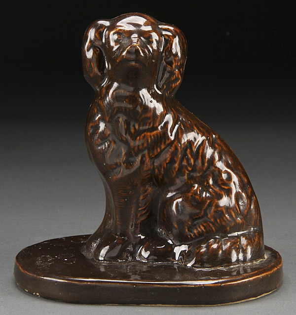 A FINE BENNINGTON POTTERY SEATED SPANIEL, MID 19TH CENTURY. With flint glaze on creamware pottery ground. Height 7 inches (17.8 cm).