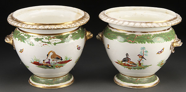 A PAIR OF STAFFORDSHIRE JARDINIÈRES, LATE 18TH/EARLY 19TH CENTURY. With hand painted birds, butterflies and florals, some damage and loss. Height 10.5 inches (27 cm), diameter 12 inches (30.5 cm).