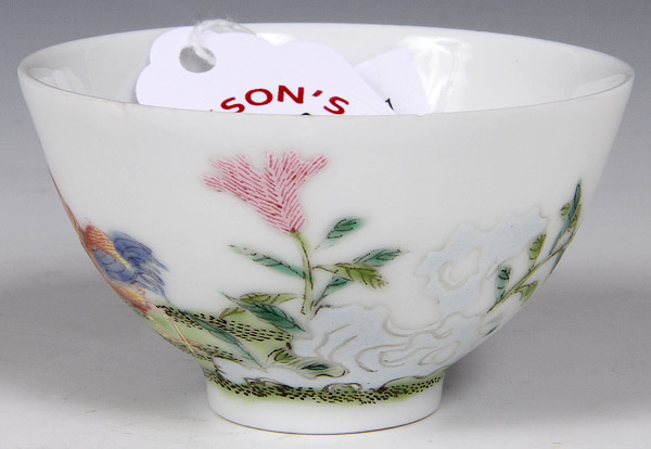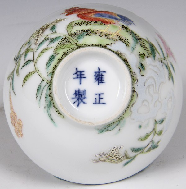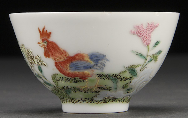 A CHINESE FAMILLE ROSE PORCELAIN COCKEREL WINE CUP, 19TH/20TH CENTURY. Finely decorated with a red cockerel and foliage and painted enamels, Yongzheng four character reign mark in blue underglaze, minor chips on rim. Height 1.25 inches (3 cm).