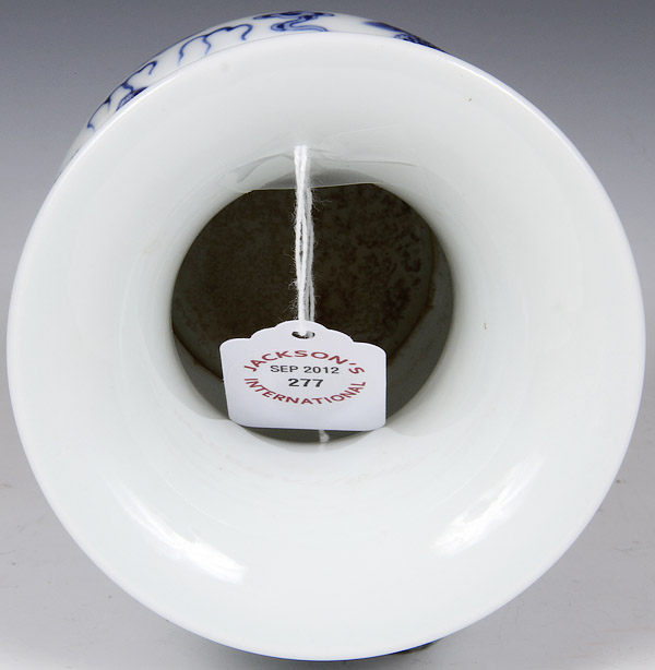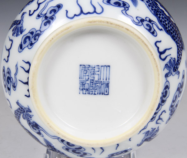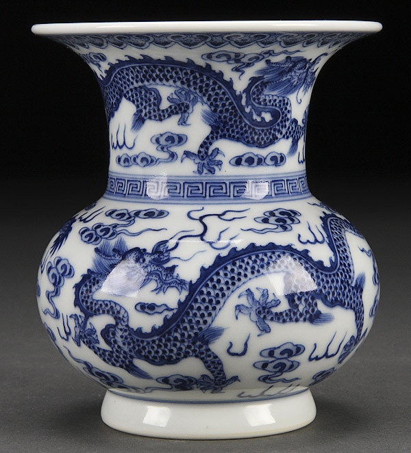 A CHINESE BLUE AND WHITE PORCELAIN DRAGONS VASE, 19TH/20TH CENTURY. Decorated with four dragons, finely painted with scrolling cloud forms. Blue Qianlong archaic seal mark on base. Height 4.5 inches (11.5 cm).
