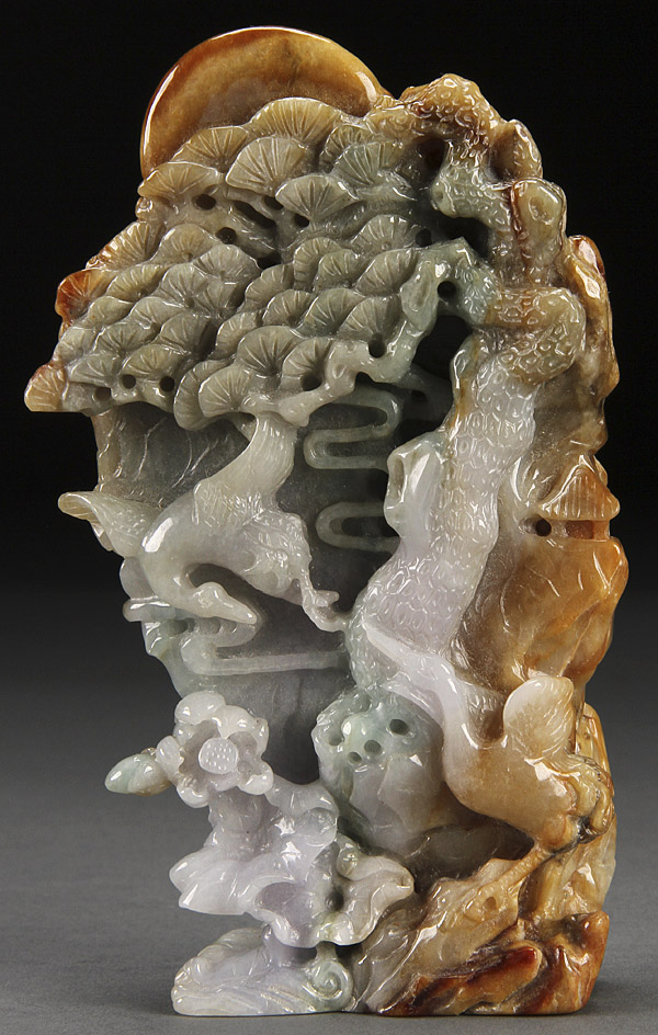 A GOOD CHINESE CARVED JADEITE BOULDER, 20TH CENTURY. Depicting cranes and a pine tree in deep relief with mountainous pagodas under a russet skin on verso. Height 6 inches (15.2 cm).