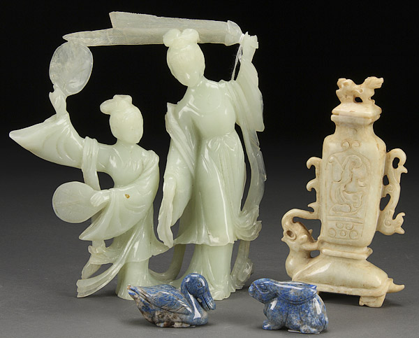 A CHINESE CARVED HARDSTONE GROUP, 20TH CENTURY. Comprising a hardstone figure of a woman and attendant, a soapstone lidded urn and a blue lapis rabbit and duck. The largest 8.75 inches (22 cm).