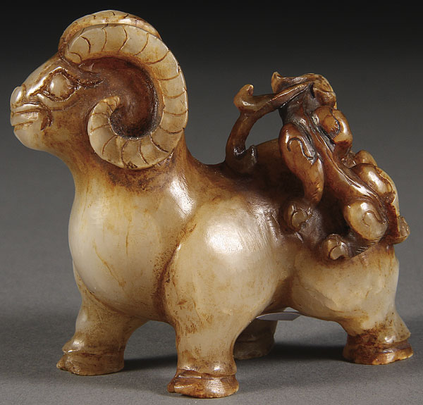 A CHINESE CARVED WHITE JADE FIGURE OF A RAM, 20TH CENTURY. With stained highlights depicted with a dragonet on hindquarter. Length 3 inches (7.5 cm).
