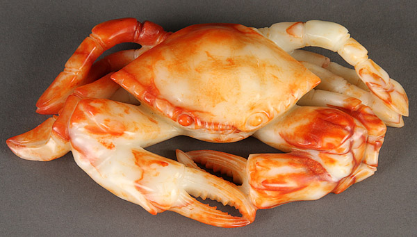 A FINE CHINESE CARVED SOAPSTONE FIGURE OF A CRAB, PROBABLY QING DYNASTY. Well carved and modeled in milky colored soapstone with deep amber highlights. Length 7.25 inches (18.5 cm).