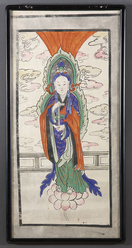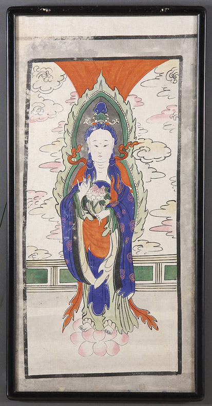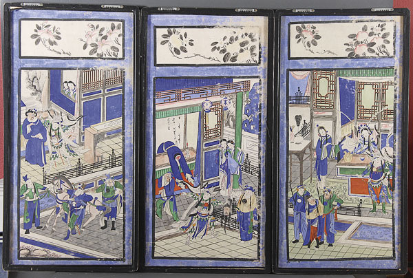 CHINESE SCHOOL, 19TH CENTURY. A GROUP OF THREE CHINESE PAINTED FABRIC PANELS. Each finely decorated with elaborate royal court scenes, and a verso with a full length depiction of Guanyin on lotus blossom. 16.5 inches by 32.5 inches (42 x 82.5 cm) in double glazed frames.