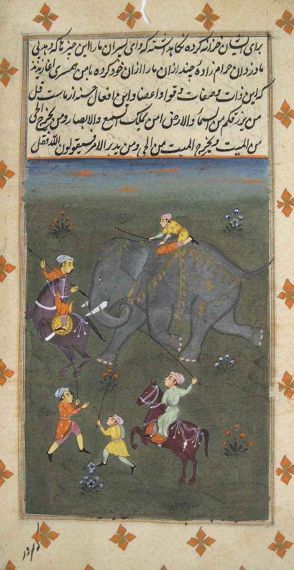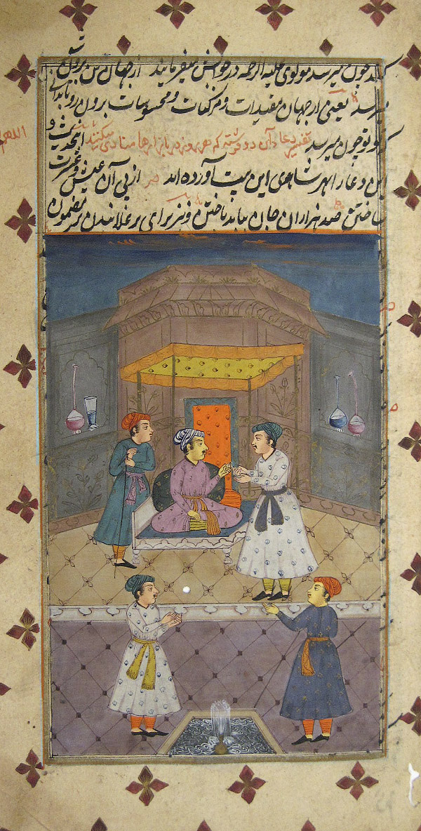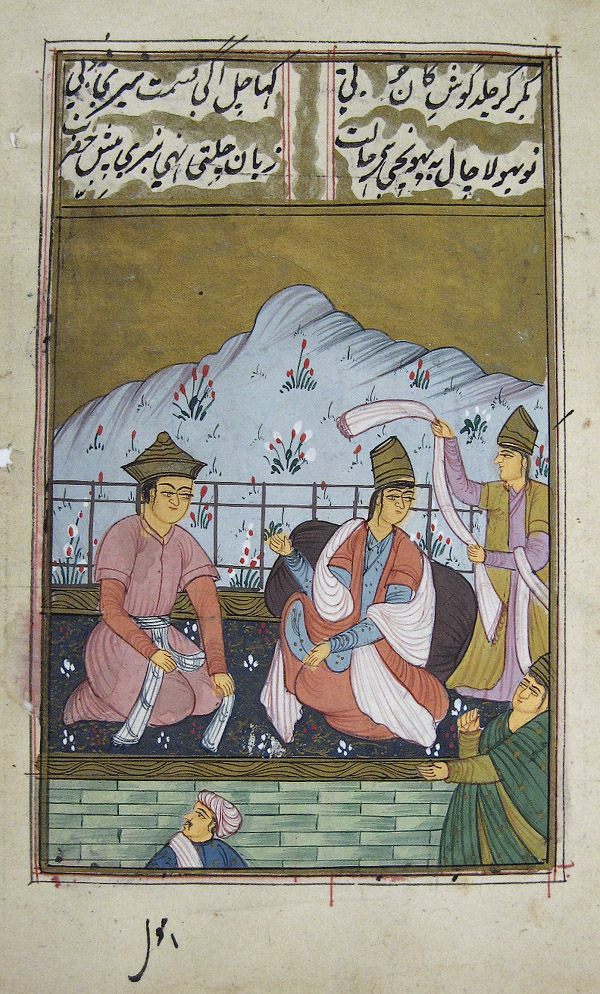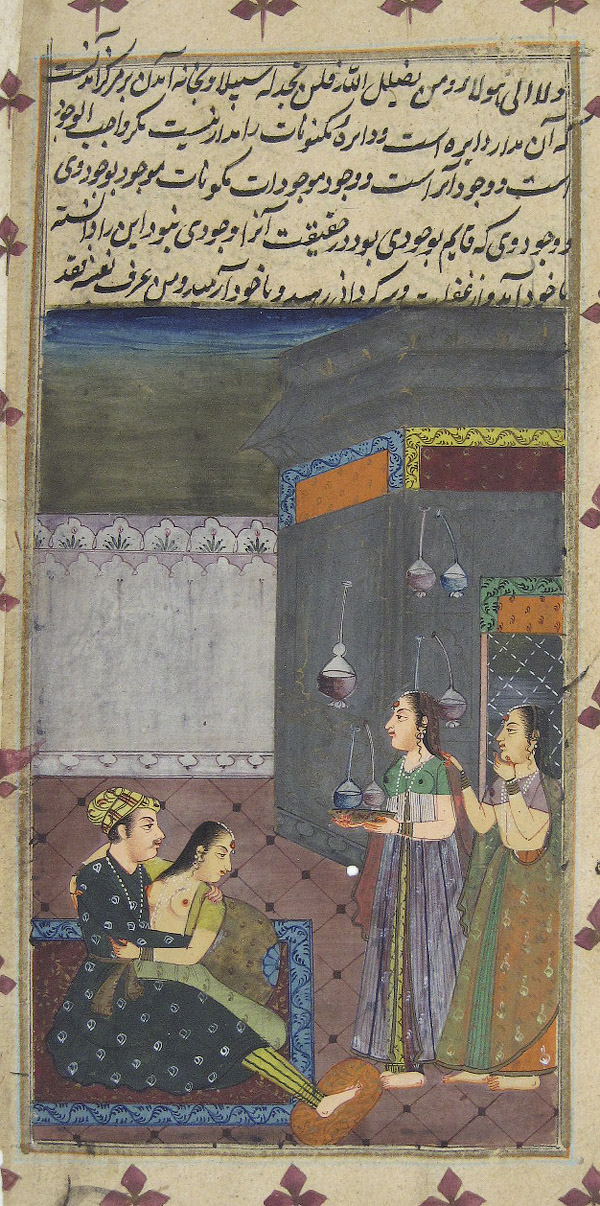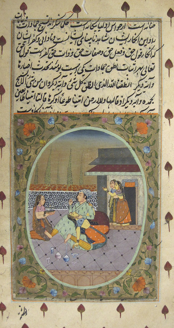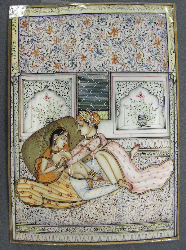 A GROUP OF PERSIAN ILLUMINATED MANUSCRIPTS, 18TH AND 19TH CENTURY. Comprising four leaves finely illuminated with narrative scenes and inscribed on verso, apparently from the same book, circa 18th century. Each leaf measuring approximately 9 inches x 5 inches (23 x 13.5 cm) and matted. Together with two later (19th century) similarly illuminated leaves each measuring approximately 7.7 inches x 5.2 inches (19.5 x 13 cm), also matted; and a miniature Persian erotic painting on ivory, circa 1800 and measuring 4.2 inches x 2.8 inches (10.7 x 7.5 cm).