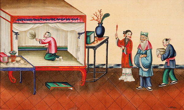 A FINE CHINESE EXPORT PAINTING, EARLY 20TH CENTURY. Gouache on rice paper depicting a theatrical play in court setting. 11.5 inches x 6.75 inches (29 x 17.5 cm).