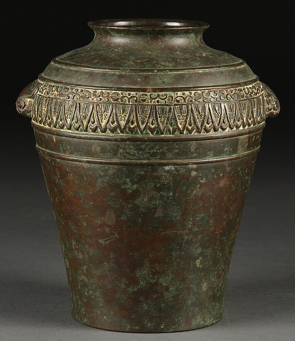 A FINE CHINESE MING STYLE BRONZE VASE, 19TH CENTURY OR EARLIER. Finely cast and sculpted with archer designs on shoulder and Kylin mask handles. Dark brown patina with verdi gras. Height 8 inches (20 cm).