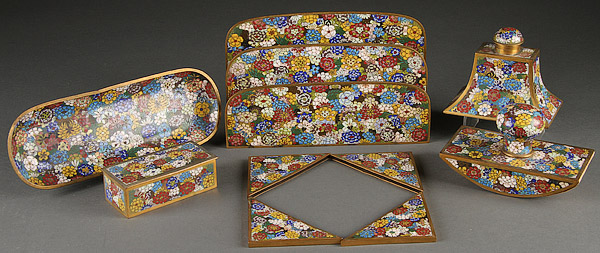 A FINE CHINESE CLOISONNÉ AND GILT BRONZE DESK SET, LATE 19TH/EARLY 20TH CENTURY. Finely enameled with an all over floral pattern comprising a letter rack, pen rest, inkwell, blotter, stamp box and desk pad corners. The largest 8 inches (20 cm) length.
