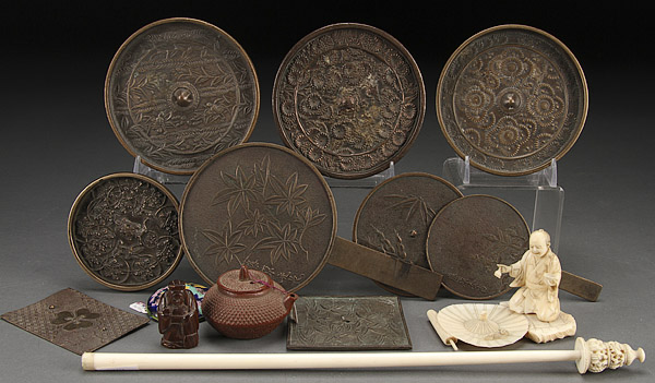 A JAPANESE BRONZE MIRROR AND CARVED IVORY GROUP, 19TH/20TH CENTURY. Comprising nine various bronze mirrors with embossed decoration, the largest 4.5 inches (11.5 cm) diameter; a carved ivory okimono of a figure decorating a parasol and startled by a rat; a carved ivory handle, length 13.75 inches (35 cm); a miniature iron tetsubin; and a cloisonné button.