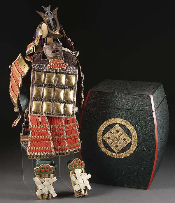 AN CONTEMPORARY JAPANESE DECORATIVE SAMURAI COSTUME MODEL, LAST HALF 20TH CENTURY. Comprised of silk, tin and gilt panels and contained in a polychrome and gilt container. Height approximately 28 inches (71.1 cm) as illustrated.