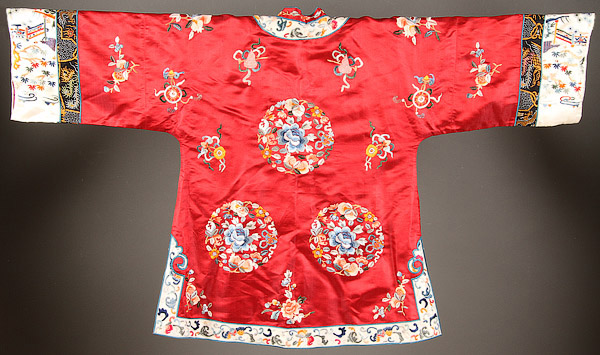 A CHINESE EMBROIDERED SILK COURT ROBE, 20TH CENTURY. Stitched with florals and Buddhist symbols on a red ground. Length approximately 29 inches (74 cm).