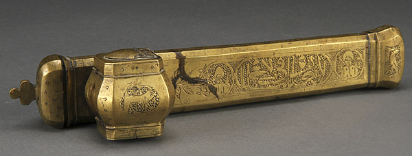 A SINO-TIBETAN PEN HOLDER/INKWELL, 19TH CENTURY. Chased with figures in medallions and Hindu script. Length 9.5 inches (24 cm).