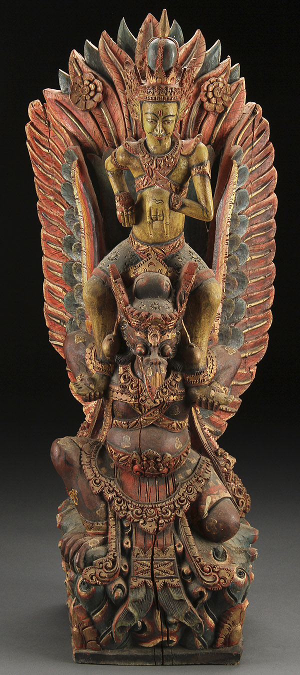 A LARGE SINO-TIBETAN CARVED AND POLYCHROME FIGURE, 20TH CENTURY. Of a deity atop a demon, foliate carved in the round. Height 30.5 inches (77.5 cm).