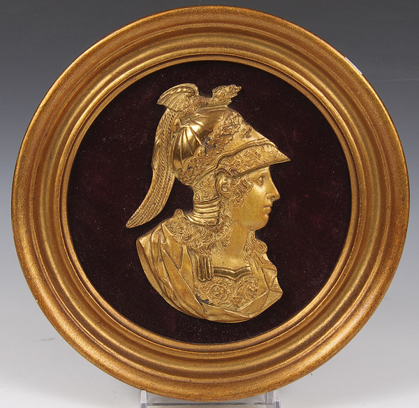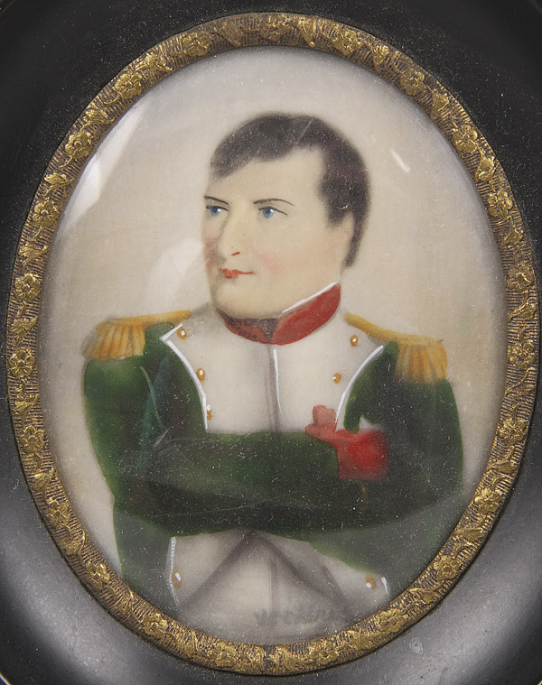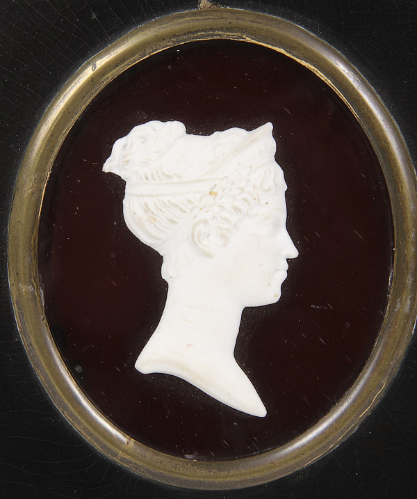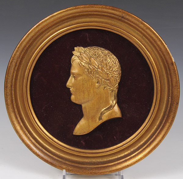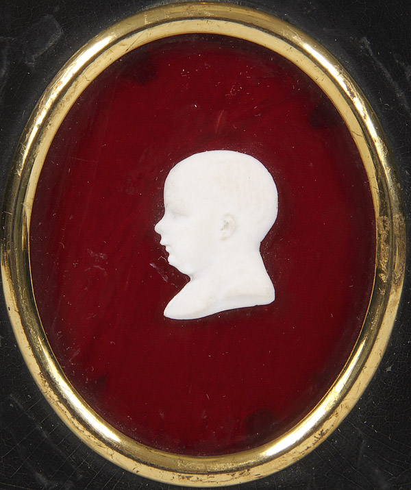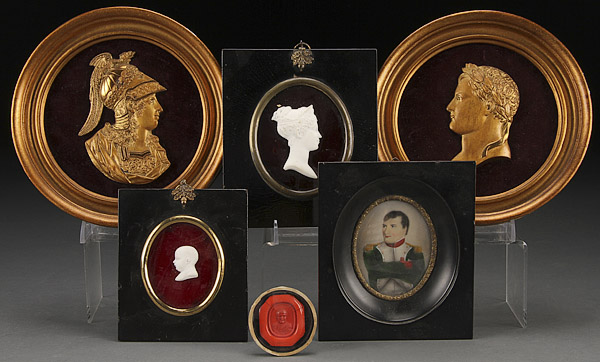 A NAPOLEONIC PORTRAIT GROUP, 19TH/20TH CENTURY. Comprising an oval painted ivory portrait, a bisque profile of infant Napoleon on ruby glass ground, a wax seal impression of Napoleon; together with a bisque profile of Josephine on ruby glass ground and two contemporary gilt metal profile plaques. The largest 7.5 inches (19 cm).