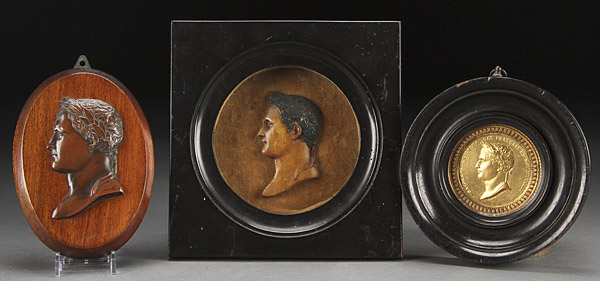 A 19TH CENTURY FRENCH NAPOLEONIC PORTRAIT GROUP. Comprising three profile portraits after Jean-Bertrand Andrieu (French 1761-1822), including a bronze on mahogany plaque, a wax in shadowbox frame and a gilt metal style medallion. The largest 8.5 inches x 8.25 inches (21.5 x 21 cm).
