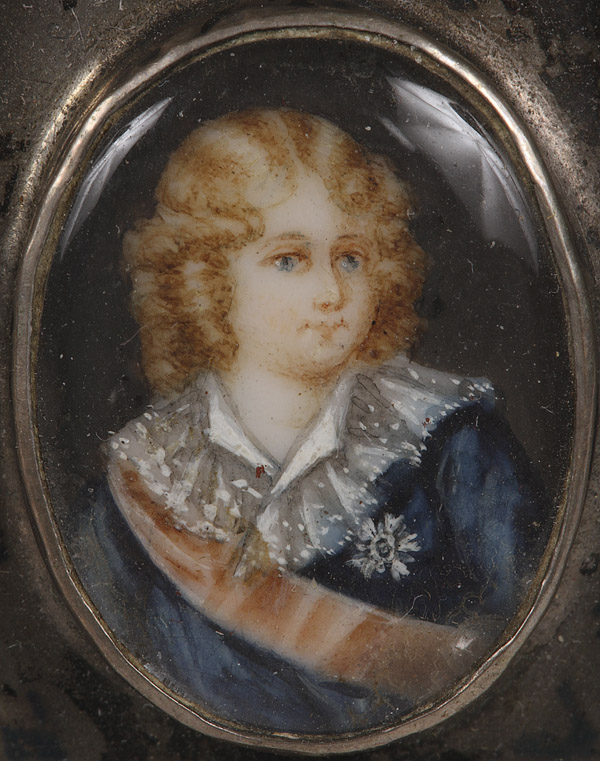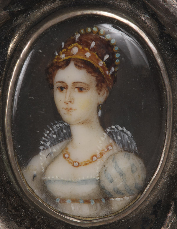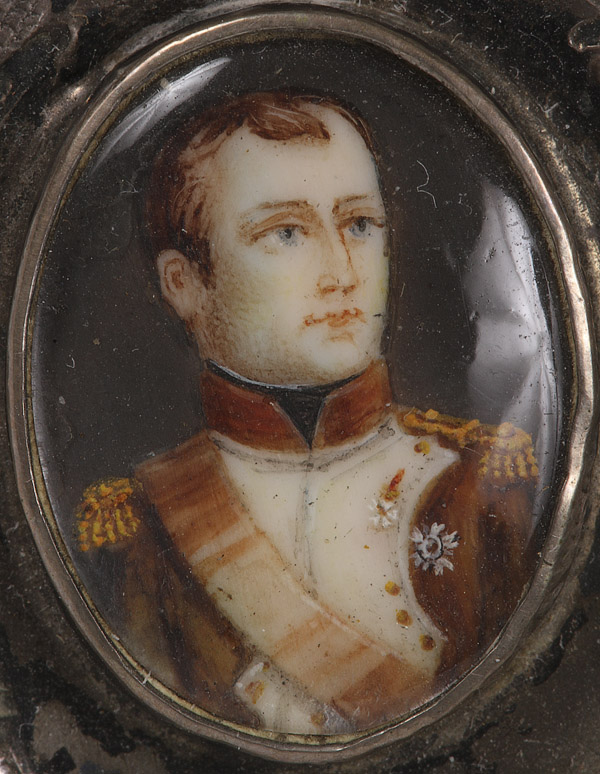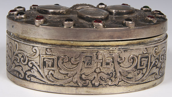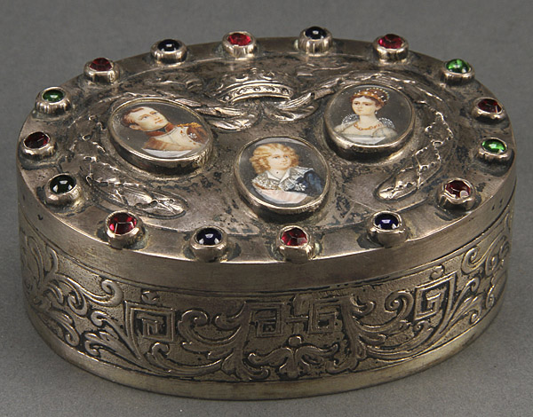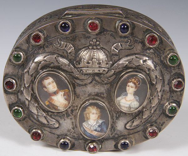 AN AUSTRIAN-HUNGARIAN SILVER REPOUSSE AND MINIATURE IVORY PAINTED NAPOLEONIC DRESSER BOX, MID 19TH CENTURY. Depicting the hand painted miniature ivory portraits of Napoleon, Maria Louisa and Francois Joseph on lid, the rim with faux red, blue and green gemstones. Stamped Austrian hallmark "13". Total weight 4.45 troy oz.