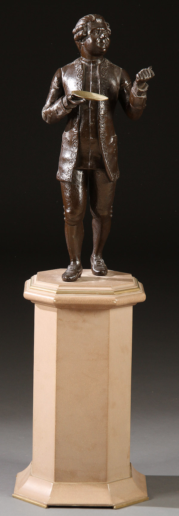 A SPELTER FIGURAL CALLING CARD RECEIVER, EARLY 20TH CENTURY. Of a porter in 18th century dress under a dark bronzed finish and holding a brass tray surmounting a wood plinth with faux stone finish. Height 39.5 inches (100.5 cm).