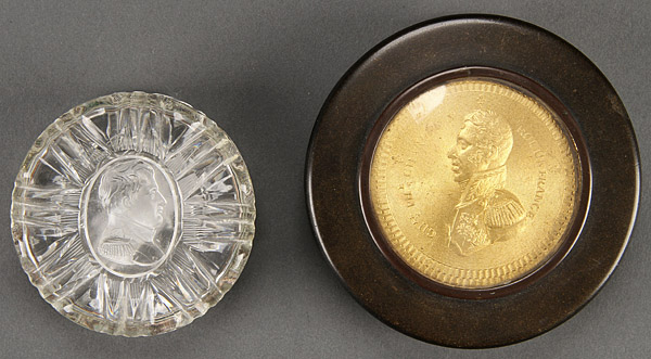 A PAIR OF FRENCH NAPOLEONIC SNUFF BOXES, 19TH CENTURY. Comprising a cut crystal box with molded and frosted profile of Napoleon probably by Baccarat and a Gutta Percha box with gilt medallion of Charles X and tortoiseshell liner. Diameter 2.375 inches (6 cm) and 3.25 inches (8.25 cm).