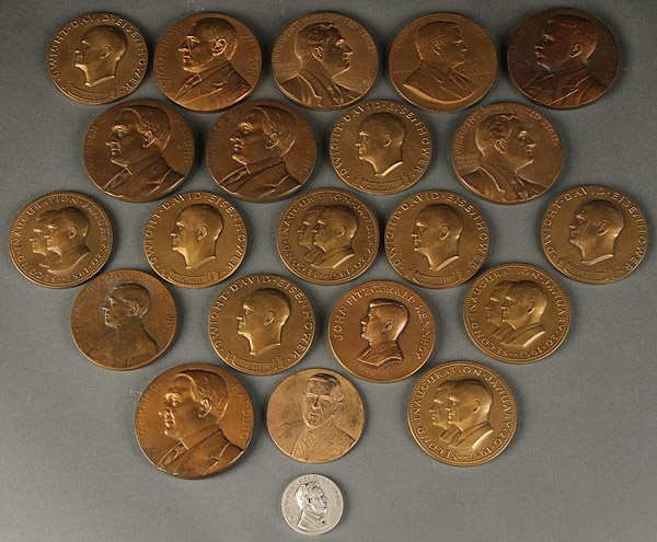 AN ASSEMBLED COLLECTION OF AMERICAN PRESIDENTIAL BRONZE MEDALLIONS, 20TH CENTURY. 21 bronze, one sterling. Comprising a Teddy Roosevelt with first and second term inaugural dates sculpted by Barber, a Woodrow Wilson Memorial by Robbins & Co., a Woodrow Wilson with first and second term inaugural dates sculpted by Morgan, a Herbert Hoover inaugural by Sinnock, two FDR memorials, three Harding memorials by Morgan, six Eisenhower inaugurals by Hancock, four Eisenhower/Nixon second term inaugurals, a Wilson/Marshall inaugural and a Kennedy inaugural by Manship. Together with a 1970 Lincoln Heritage Trail in sterling by Metallic Art. The largest 2.875 inches (7.4 cm).