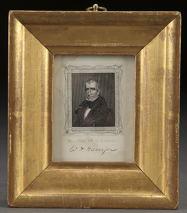 A PRESIDENT WILLIAM H. HARRISON ENGRAVED PORTRAIT CARD, CIRCA 1840. By Nathaniel Dearborne, Boston. Titled Maj:Genl Wm. H. Harrison and signed W.H. Harrison in the plate. Contained in a period gilt wood frame. 3.5 inches x 4.5 inches (9 x 11.5 cm), 6 inches x 7 inches (15 x 18 cm) overall. Contained in a period gilt wood frame.