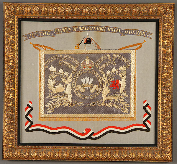 A VERY FINE PRINCE OF WALES TENTH ROYAL HUSSARS EMBROIDERED CAMPAIGN BANNER, LATE 19TH CENTURY. Finely embroidered in polychrome silks and gold threads with the Prince of Wales' royal cypher and banners lettered with various campaigns including Afghanistan 1879, South Africa and Egypt 1884. 18 inches x 20 inches (46 x 51 cm) and contained in a contemporary embossed and gilt frame 23 inches x 25 inches overall (58.5 x 64 cm).