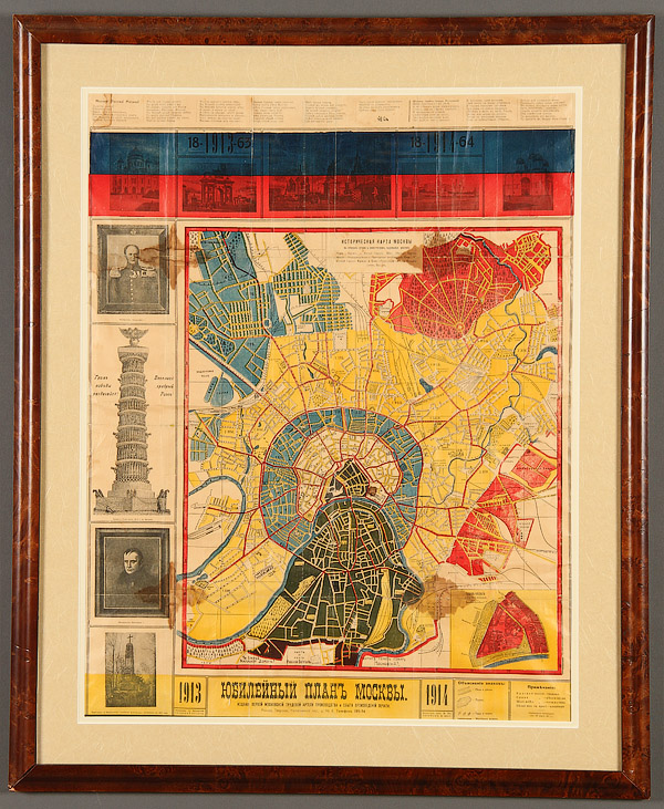 AN IMPERIAL RUSSIAN PERIOD PRINTED COLOR BROADSIDE MOSCOW MAP. Commemorating the 100th anniversary of the Russian victory over the French Invasion War of 1812. Contained in a contemporary glazed frame. 27.25 inches x 21.25 inches (69.5 x 54 cm).