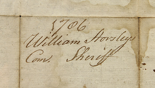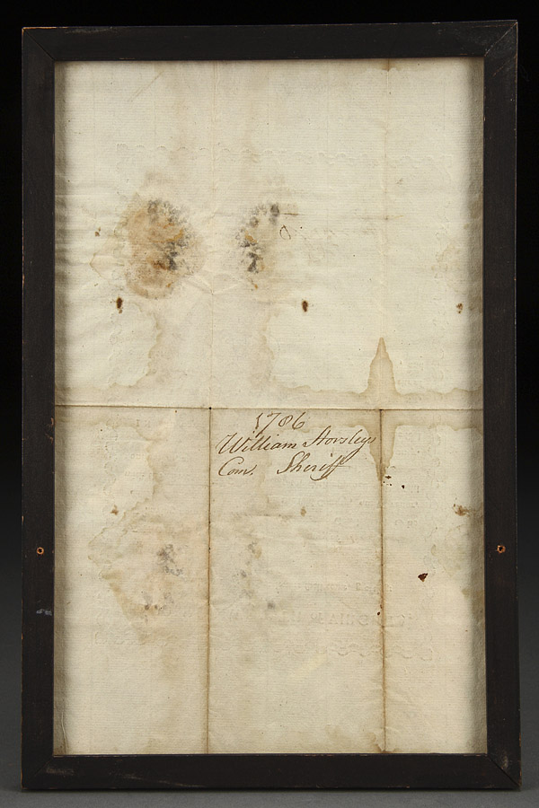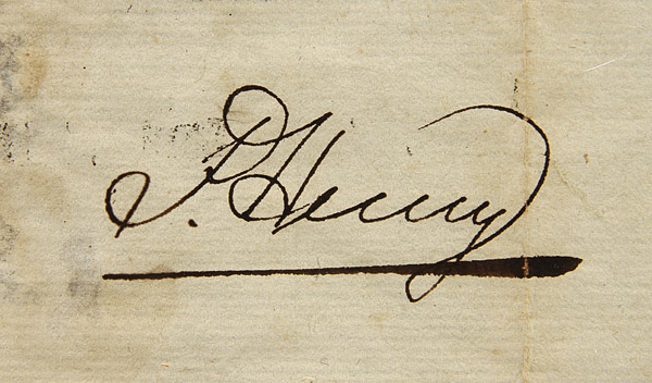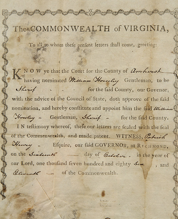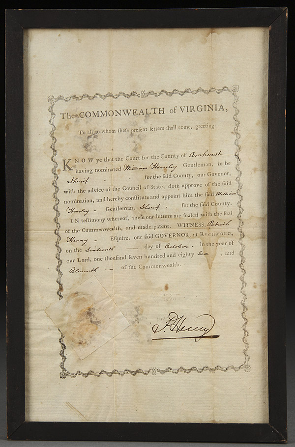 A PATRICK HENRY SIGNED DOCUMENT DATED 1786. Appointing William Horsley to Sheriff of Amherst County, Virginia, dated 16th of October, 1786 with paper seal lower left and signature of P. Henry lower right. A strong and distinct signature, paper with some discoloration and fold marks, 7.5 inches x 12.25 inches (19 x 31 cm). William Horsley (1722-1763) served in the military from 1778-1781 and was lieutenant in the Revolutionary Parents.
