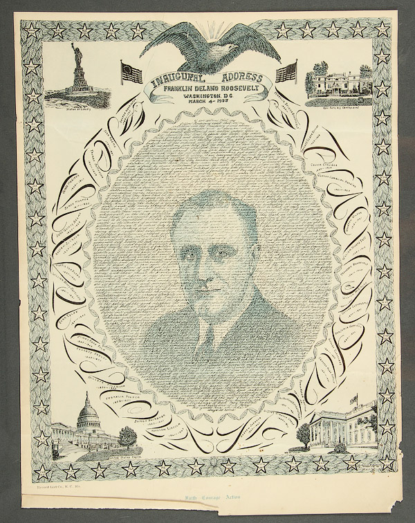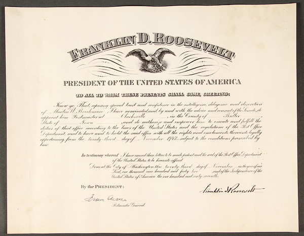 A FRANKLIN D. ROOSEVELT PRESIDENTIAL APPOINTMENT, 23RD OF NOVEMBER 1942. Appointing Martin W. Brockman to Postmaster at Clarksville, Iowa, signed Frank Walker Postmaster General lower left with Franklin D. Roosevelt facsimile signature lower right together with a printed calligraphy portrait composed of FDR's 1933 Inaugural Address by Claude Halbert. The largest 14 inches 18 inches (35.5 x 45.5 cm).