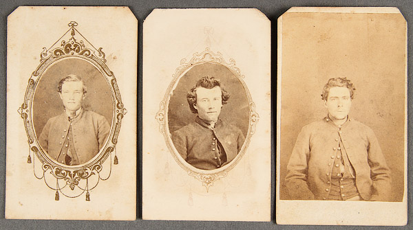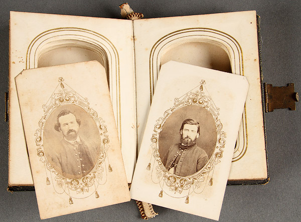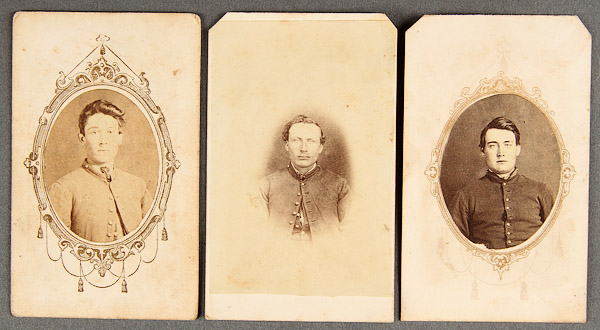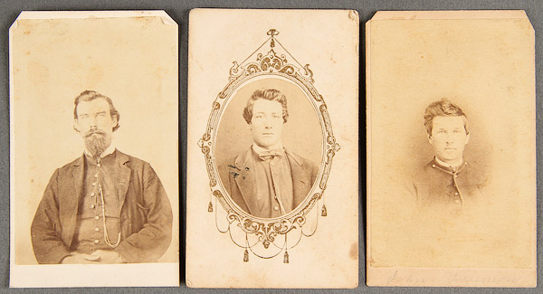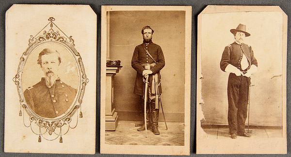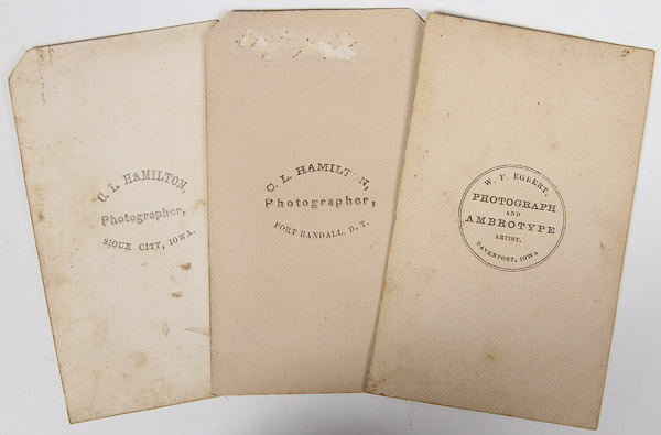 A CIVIL WAR AND DAKOTA WARS CDV PHOTO GROUPING. Comprising 17 images, all from the same leather bound album and including General Alfred Sully, a standing cavalry officer- photographer's backstamp of W.P. Egberg, Davenport, Iowa; another standing officer faintly inscribed as Capt…. and photographer's backstamp "C.L. Hamilton Fort Randall D.T."; a seated solider, photographer C.L. Hamilton, Sioux City, Iowa; a standing Santee Sioux wrapped in blanket- probably a Hamilton image based on flour pattern; and three others with faint inscriptions.