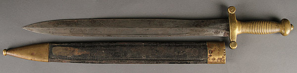 A FRENCH CIVIL WAR ERA MODEL 1831 FOOT ARTILLERY SWORD. Hilt marked Chatellerault, and with leather scabbard. Overall length 25.75 inches (65.4 cm).