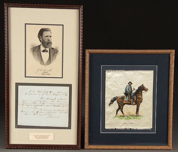 AN AMERICAN CIVIL WAR RELATED GROUPING, CIRCA 1860-1975. Comprising a General J.C. Smith framed portrait engraving and signed letter dated “Galena, February 2, 1860”, 20.75 inches x 11 inches (52.7 x 28 cm); together with a framed U.S. Grant tobacco blanket printed on silk, 8.25 inches x 6.75 inches (22.3 x 17.2 cm). Overall 12.75 inches x 14.5 inches (32 x 37 cm).
