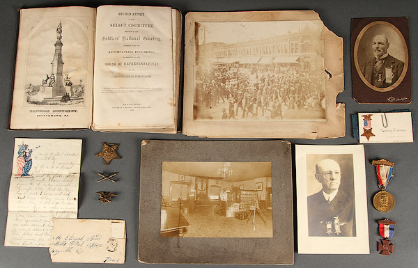A GROUP OF CIVIL WAR AND G.A.R. MATERIAL. Comprising of well over two dozen individual items including the discharge and naturalization papers of Elijah Bond H.Co 17th Cavalry Regiment, Illinois Volunteers, dated 1865 and 1867; a large unused Union Soldier Memorial Discharge certificate; a large ornate lithograph printed on canvas, service memorial credential modeled on the National Monument and inscribed to "Olender A. Salisbury" 95th Regt. Illinois Volunteer Infantry, four G.A.R. membership and honorable discharge certificates; cabinet card photographs of G.A.R. post commanders and conventioneers; a Civil War's soldier letter written on patriotic stationary dated "Oct. 25, 1861" together with a G.A.R. medal, Civil War uniform buttons, and a 32nd National Encampment G.A.R medal dated "1898 Cincinnati, OH". Together with a printed copy of "Revised Report of the Select Committee relative to the Soldiers' National Cemetery, together with the Accompanying Documents, as reported to the House of Representatives of the Commonwealth of Pennsylvania dated 1865, and a G.A.R. convention autograph book, together with various other related items.