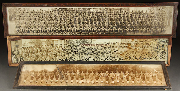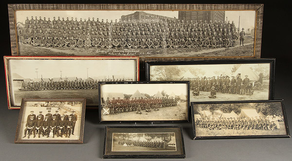 A U.S. WWI PANORAMIC PHOTO GROUPING. Comprising ten framed photos, including four yard long examples, Co. C 313th Field Signal Battalion, Camp Merritt, N.J., training company detachment Rahe's Army School, Kansas City, M.O., base hospital band, Camp Dodge, I.A., and Company B at an unknown Army camp. Also including two smaller Iowa 53rd National Guard photographs (circa 1905), officers of the U.S.S. Orion and other images.