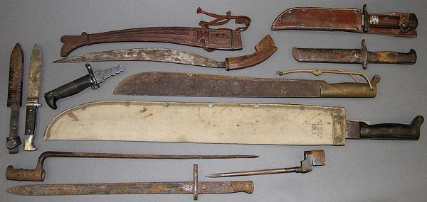 A GROUP LOT OF NINE WWII AND EARLIER EDGED WEAPONS. Comprising a USN MK1 Jungle machete with canvas sheath, blade dated 1944 and maker's mark "Legistimus-Collins & Co."; a 1945 dated True-Temper machete; an interesting re-worked 1903 Springfield bayonet converted into a fighting knife and retailed by R. S. Elliott Arms Co., Kansas City, MO together with original sheath; a Hitler Youth knife missing HJ diamond in handle; a British MKII/IV Enfield bayonet with broad arrow stamps, a 19th century US stamped socket bayonet, a USN MK1 grand-style handle for plastic training bayonet, a relic quality Brazilian Mauser bayonet, an M31 shortened Schmidt-Rubin bayonet; and a Filipino teakwood jungle fighting knife.