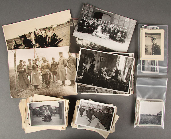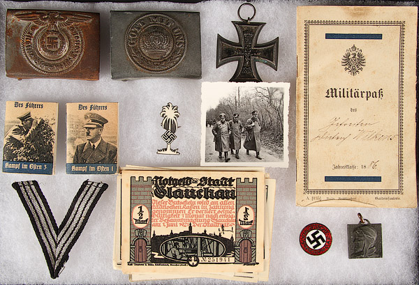 A GERMAN WWI AND WWII MEDAL, INSIGNIA AND PHOTOGRAPH GROUP. Comprising a German WWII SS EM steel belt buckle, a WWI EM belt buckle "Gott Mit Uns", an 1886 dated German Militarpass, two miniature Furhrers booklets, a WWII enameled Afrika Korps lapel pin, a WWI iron cross, a Waffen SS embroidered silver honor chevron, 40 separate German notgeld currency, and Italo-German Italo Balbo medal, an enamel Nazi party pin (RZM stamped) and a collection of well over 50 original German military related photos, circa 1938-1943.