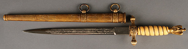A GERMAN NAVY OFFICER'S DAGGER. With etched blade, apparently circa 1945, but with de-Nazified pommel (eagle with no swastika). No maker's mark.