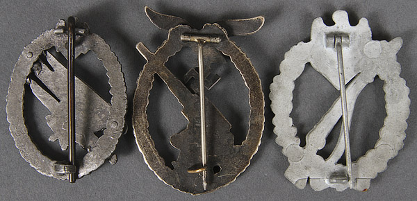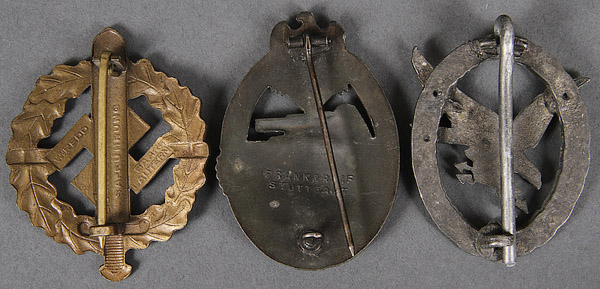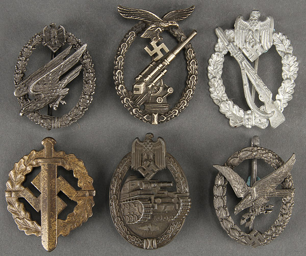 A GROUP OF GERMAN WWII AND LATER BADGES. Comprising a post war Paratrooper badge, an Army Flak badge- Junker marked probably post war, Infantry Assault badge- late war, bronze SA sports badge- original and maker's mark of W. REDO- SAARLAUTERN, Tank Assault badge- original, maker's mark FRANK & REIF, and a Luftwaffe Radio Operator's badge- postwar.