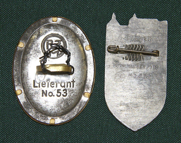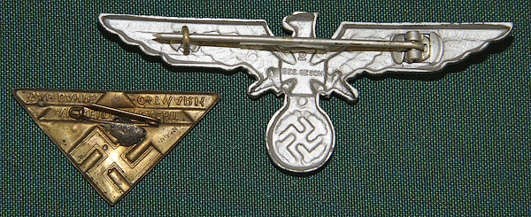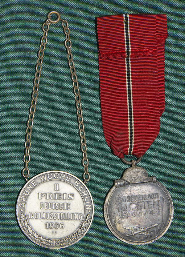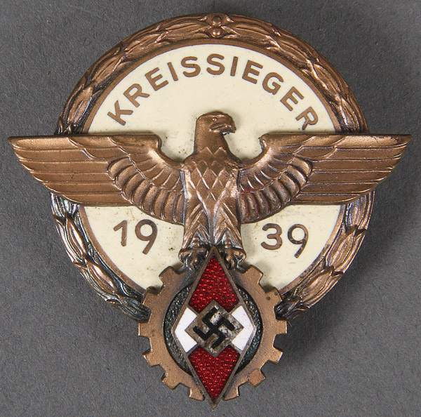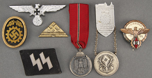 A GERMAN WWII INSIGNIA AND BADGE LOT. Comprising of eight authentic Nazi period (1933-1945) insignia including a Veterans Association peaked cap eagle, Bevo embroidered oval labor pin with RZM on verso, Arbeitsschlacht tinnie, Eastern front medal, NSBO Day tinnie, 1939 H.J. Kreissieger badge- H. Aurich- Dresden, silk Bevo SS collar tab and a nice 2nd prize medal- Germany Hunting Exhibition, Berlin 1936.