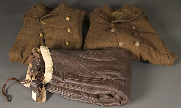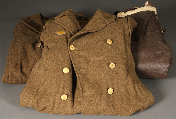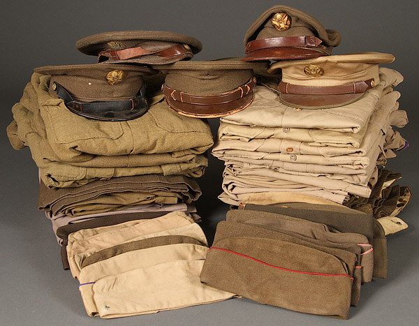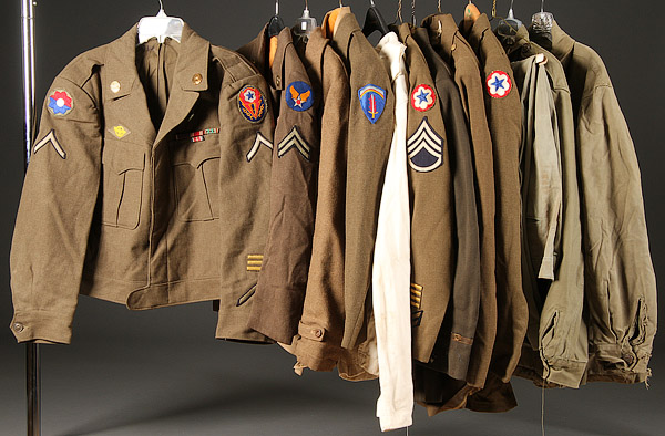 A 70 PIECE WWII UNIFORM GROUP. Comprising two vintage M43's, three EM four-pocket blouses- some with insignia, an officer's four-pocket blouse, three Ike jackets, eight pairs of EM pants, three pairs of officer pinks, a pair of Sherling US Air Force flight pants, a 10th Mountain Division style ski anorak, two US army wool overcoats, a pair of HBT coveralls, five EM peaked caps, two dozen overseas caps in both khaki and wool and more. A real treasure trove.