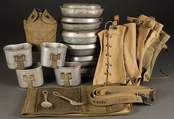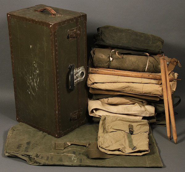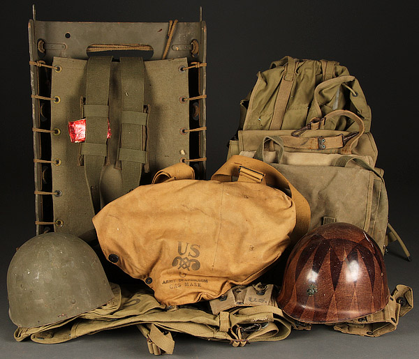 A 75 PIECE US WWII EQUIPMENT GROUPING. Comprising a liner made by Westinghouse, a liner made by CAPAC with Marine Corp anchor & globe device and plastic interior strapping, a '43 dated Meese mountain pack, a '42 dated Crawford-Austin—Waco TX M-28 pack, and three officer’s musette bags, Kadin 44, Hamlin 42 and BBS 43. 4 canteen cups, 6 mess kits including an ACM 42, a Leyse 44, a Knapp-Monarch 41 and an MA Co 43, a '43 dated Vollrath canteen with cup and '41 dated Baier-Lockwood cover, a metallic belt link ammo bag and an officer’s canvas map case cover, an M1VA1 Army Diaphragm Gas Mask with filter hose and khaki carrier, eight mismatched canvas leggings, a rubberized jungle food bag, a folding jungle medical kit w/out contents, one OD #3 and two OD#7 pistol belts, eight belts/straps, two with open-faced square buckle latches, an unissued backboard with original instructions in red cellophane wrapper, an OD wool pullover toque, a '42 dated Hinson 30 cal ammo belt and a brown helmet net with drawstring. Together with a foot locker and a collection of US WWI—Vietnam era Army canvas items including ten duffle bags, two rubberized waterproof tarps, A CS—18 folding OD#7 cases, an either pre-WWII or BSA pup tent, and two oil cloth WWI shelter halves with tent stakes.